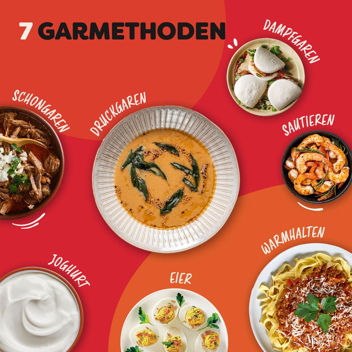 - 7-IN-1-FUNKTIONALITÄT – Schnellkochen, langsames Garen, Anbraten, Dämpfen, Eier kochen, Joghurt zubereiten und Warmhalten: alles in einem kompakten Gerät!