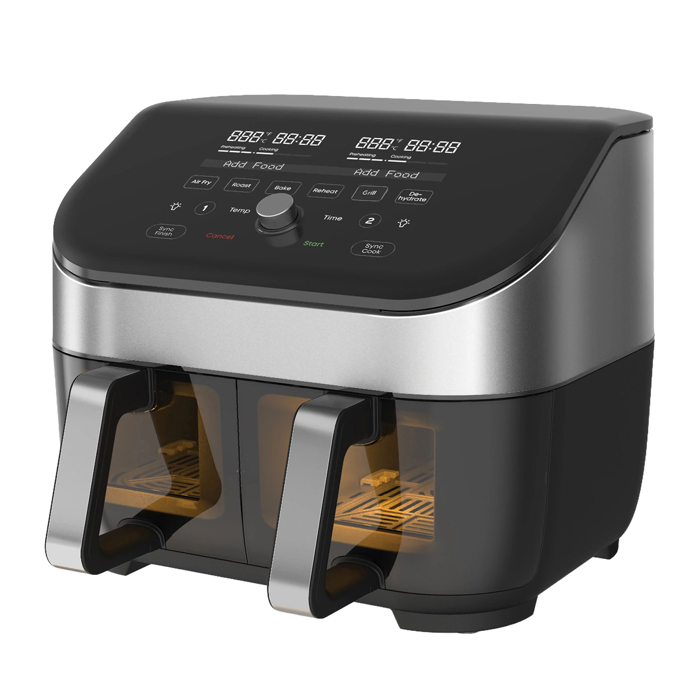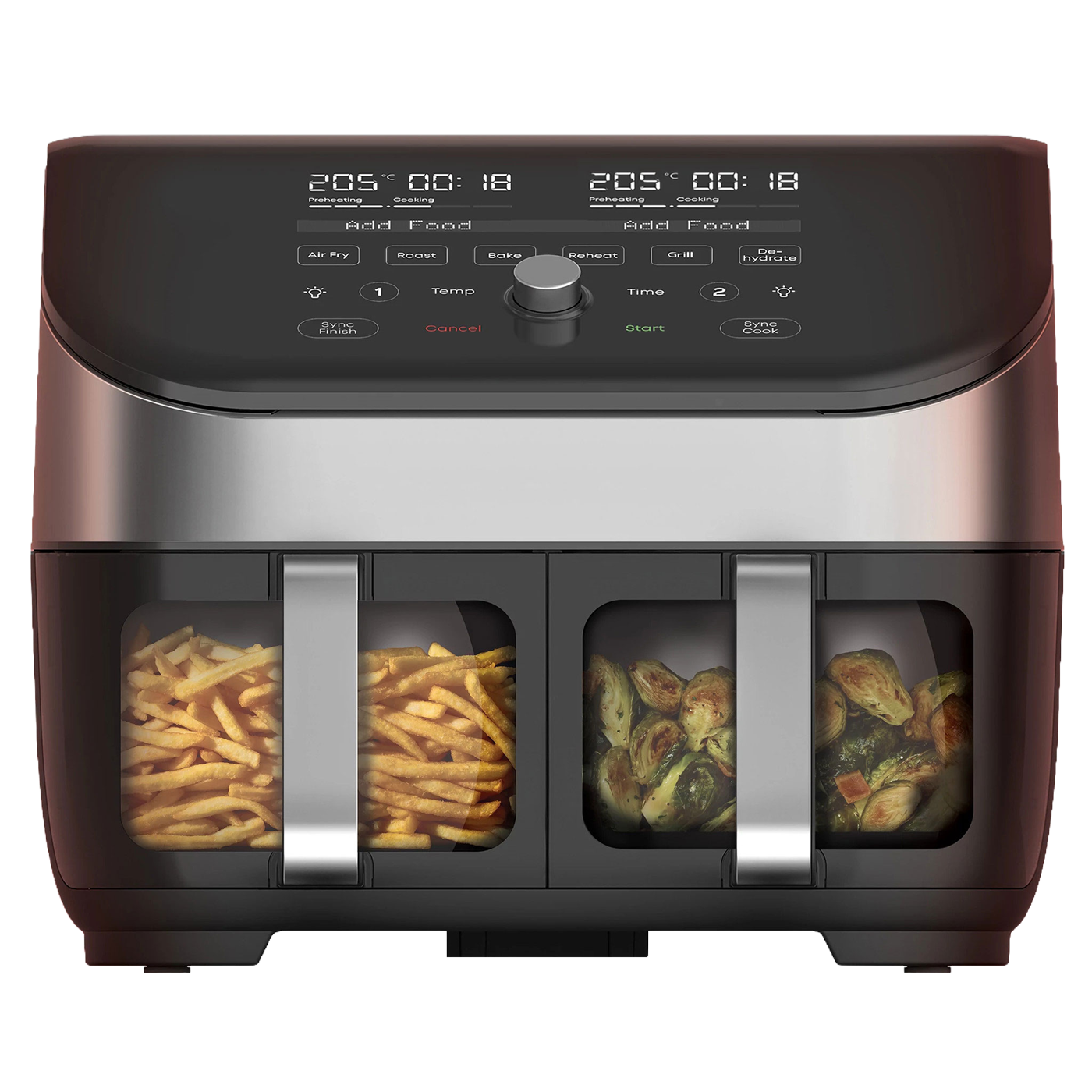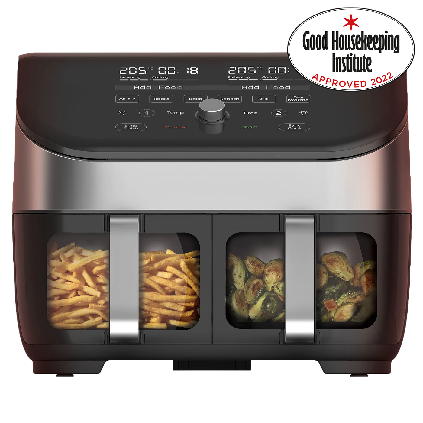 Erhältlich in Edelstahl oder Schwarz, passt sich der Vortex Plus Dual jeder Küche an. Die Antihaft-beschichteten Körbe und Tabletts sind leicht zu reinigen, während die ClearCook-Fenster für volle Sicht auf das Essen sorgen. Für eine optimale Sichtbarkeit wird empfohlen, die Körbe von Hand zu spülen, um Dampfablagerungen auf dem Glas zu vermeiden.